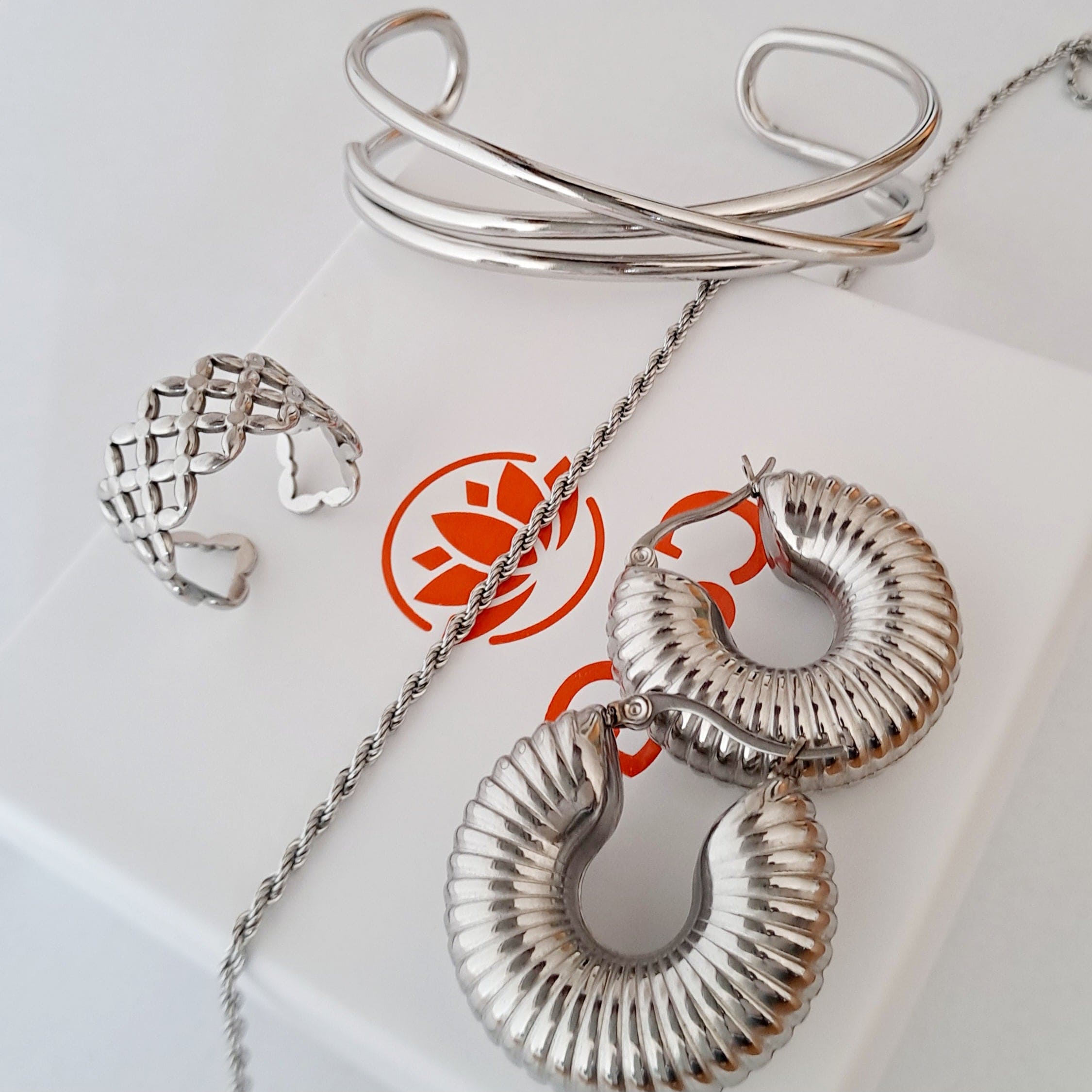 Regulärer Preis €28,00Verkaufspreis €28,00 Regulärer PreisEinzelpreis / proSet composto da anello regolabile, braccialetto rigido, collana e orecchini Acciaio inossidabile Ipoallergenico Waterproof Braccialetto: 25g, diametro 60mm larghezza 19mm Collana: Spessore 2mm, lunghezza 55cm